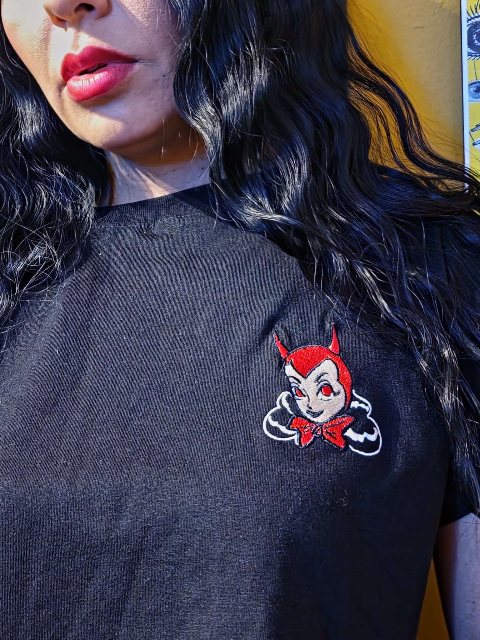 Cotton shirts embroidered with my version of a cute kewpie-style she-devil 💋 This crop top brings a touch of mischief to any outfit.